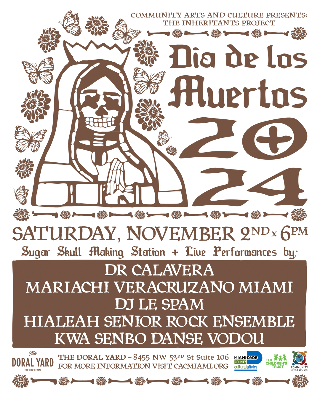 Doral, FL – October 14, 2024 – Dia de los Muertos(Day of the Dead) is a celebration of life. Community Arts and Culture (CAC) is presenting an evening of live music from Dr. Calavera, Mariachi Veracruz Miami, and the Hialeah Senior Rock Ensemble, dance numbers by Kwa Senbo Danse Vodou, musical selections by DJ Le Spam, face painting, and a sugar skull-making workshop at The Doral Yard (8455 NW 53rd St Suite 106, Doral, FL 33166) on Saturday, November 2, 2024, beginning at 6 p.m.