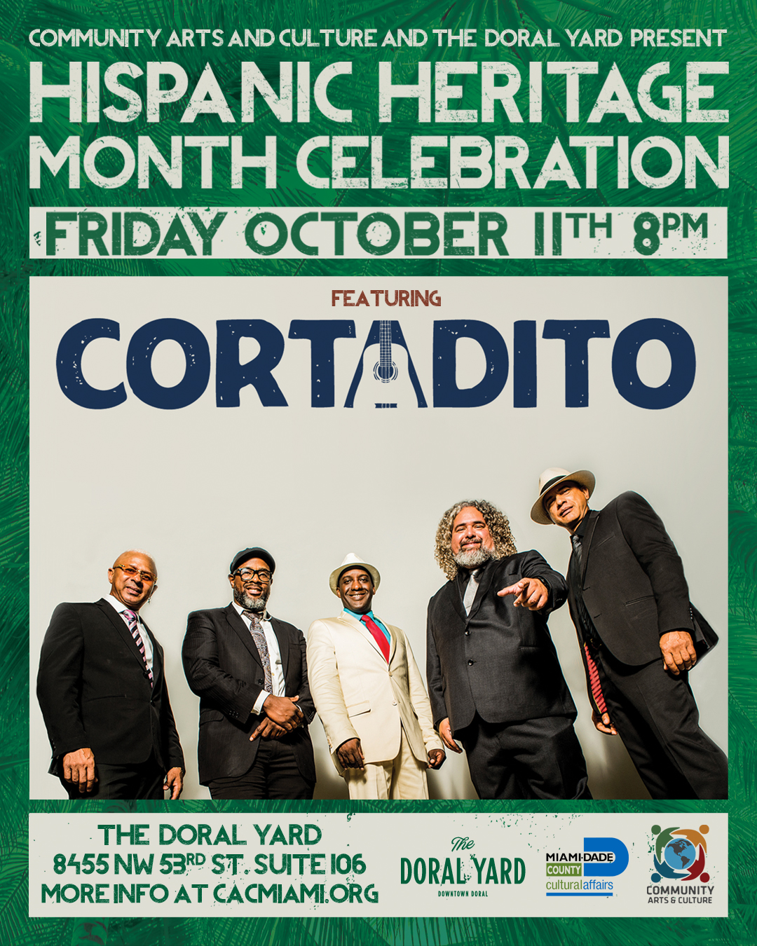 Miami, FL – September 23, 2024 – Community Arts and Culture (CAC) is celebrating Hispanic Heritage Month (September 15 – October 15) with a free event featuring the Cuban folk group Cortadito. The event will take place at The Doral Yard (8455 NW 53rd St Suite 106, Doral, FL 33166) on Friday, October 11, beginning at 8 p.m.