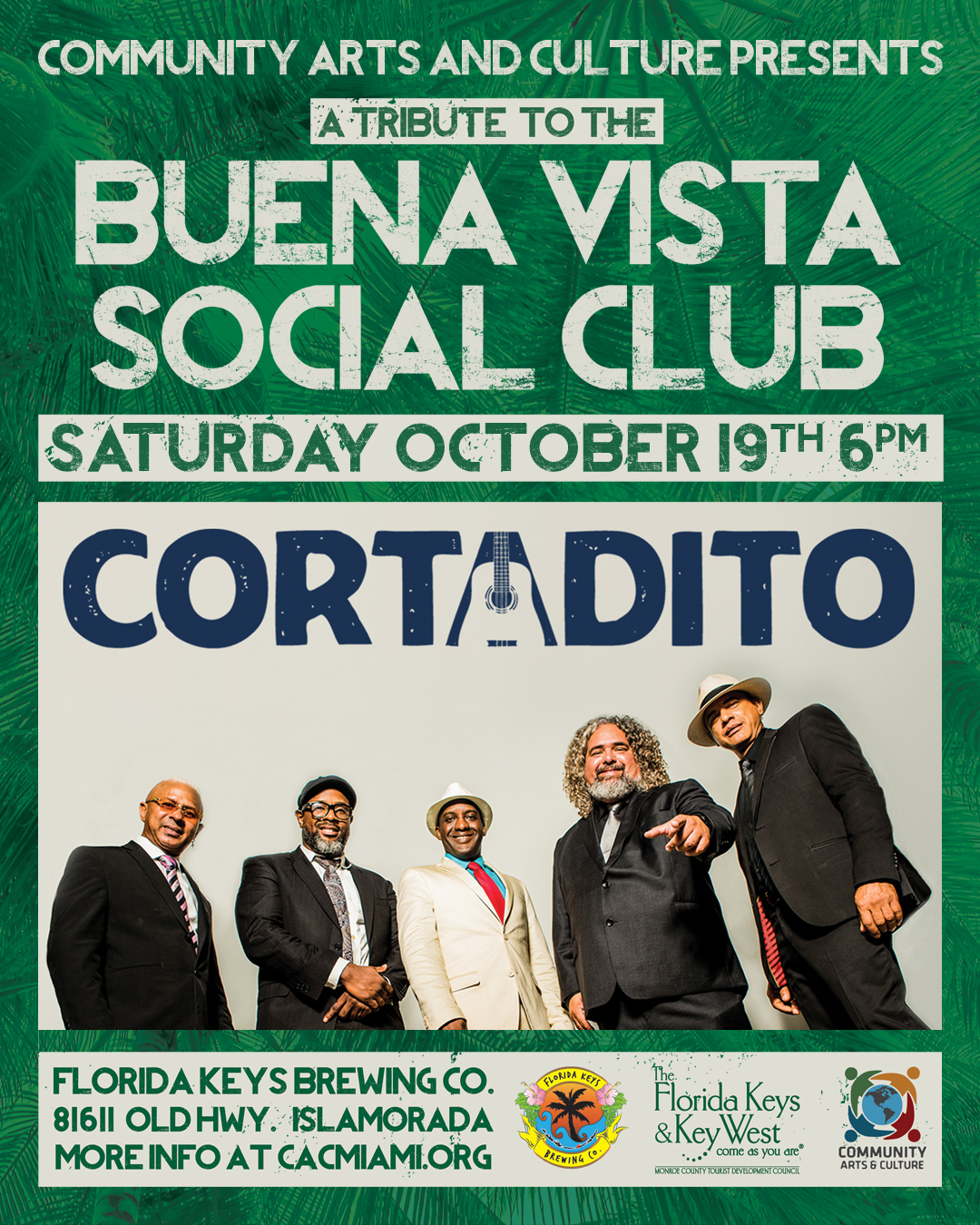 The band plays the Florida Keys Brewing Company (81611 Old Hwy, Islamorada, FL 33036) on Saturday, October 19, during a very special tribute to Cuban music icons the Buena Vista Social Club (BVSC) beginning at 6 p.m. Cortadito will perform classics from the Grammy-winning BVSC album, along with original music from their upcoming full-length release Guajiro Triangle.